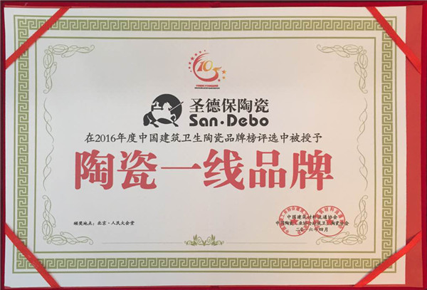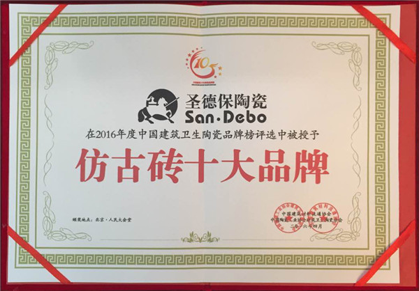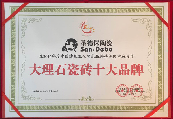 據悉,第五屆中國陶瓷榜評選是通過網絡投票得出,除了保證公正公平,還做到公開透明,讓更多的陶衛企業和消費者參與進來,主委會對項目得票數最高的前幾家企業頒發榮譽牌匾,以示肯定。圣德保陶瓷憑借著自身優質的產品,貼心的服務,良好的口碑在眾多品牌中脫穎而出,穩進前十,最終喜獲“陶瓷特色家裝品牌”、“大理石瓷磚家裝裝修設計品牌”、“仿古磚家裝裝修設計品牌”等榮譽,實至名歸。