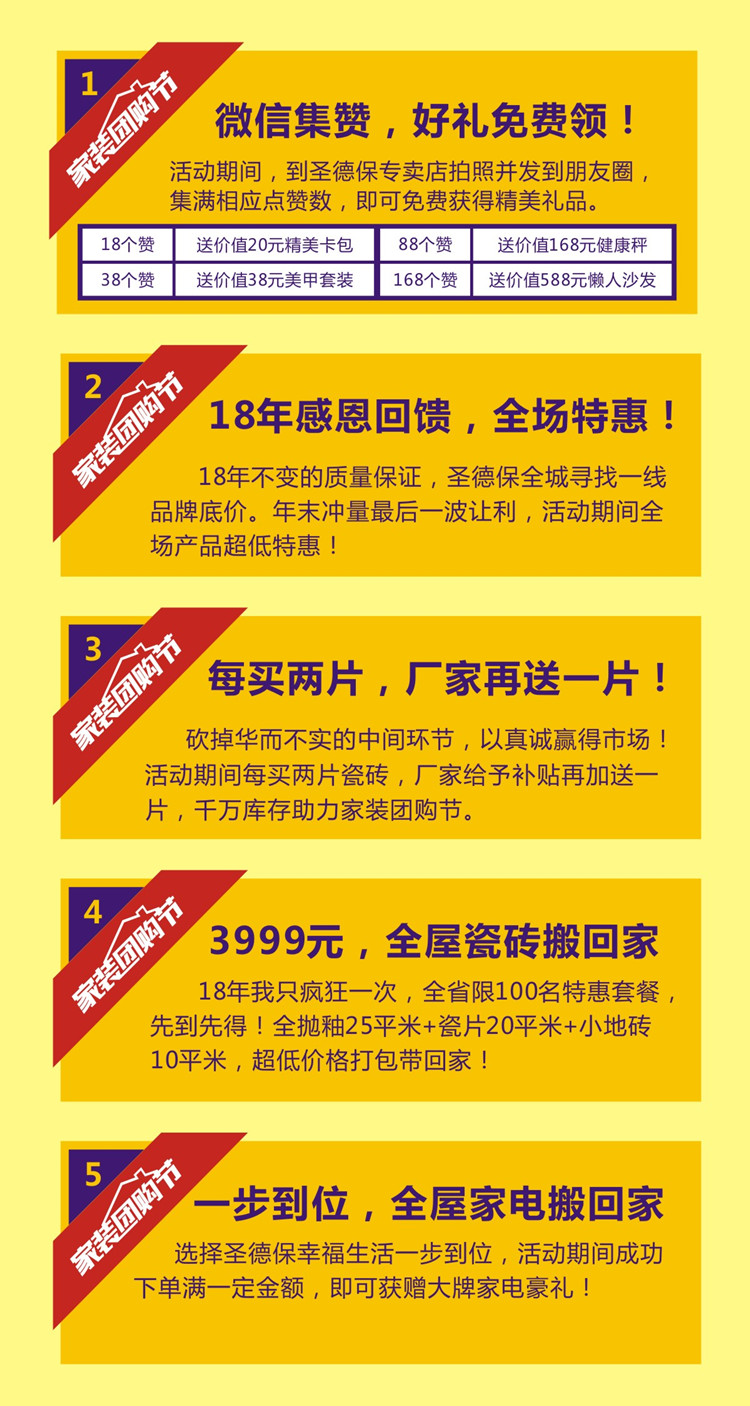 家裝裝修設(shè)計(jì)陶瓷品牌圣德保陶瓷為了辭謝新老客戶的厚愛,現(xiàn)正在全國各地開展家裝團(tuán)購節(jié)活動(dòng),廠家全程支持,優(yōu)惠的價(jià)格讓利于您,更有豐厚的獎(jiǎng)品拿,詳情請(qǐng)咨詢當(dāng)?shù)厥サ卤Yu店。