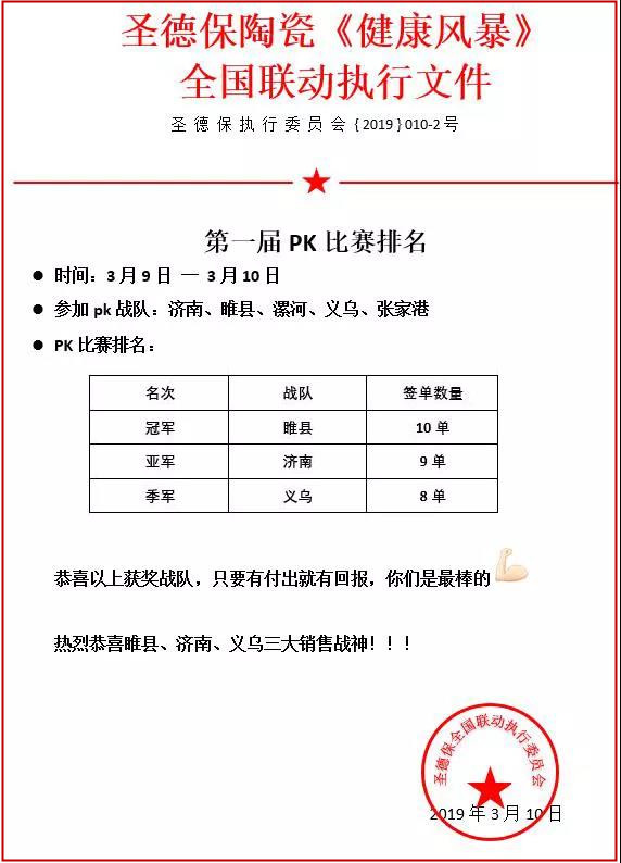 健康風暴 惠在3.15——圣德保陶瓷全國聯動從2月28日正式落地到3月10日這短短10天時間里,全國各地終端專賣店就迅速迎來開年首個開門紅,各店頻簽大單,各線捷報頻傳,開局就贏得滿堂紅!