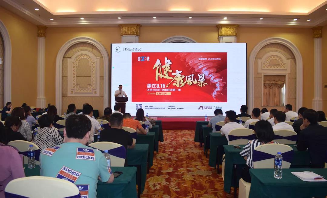 圣德保陶瓷銷售總經理嚴偉才就春季陶博會以及圣德保3.15全國聯動兩方面,回顧了第一季度的行業動態與品牌經營成果,分析當下及未來產品、市場渠道的發展趨勢,從行業走勢延展到品牌自身,系統地闡述了品牌的發展方向,向與會者呈現圣德保陶瓷綠色生態新商業的戰略思考,以基于市場需求的優質產品與創新營銷服務系統助力客戶領跑市場。